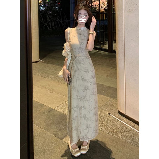 Sleeveless Stand Collar Floral Print Midi A-Line Dress / Shrug / Set