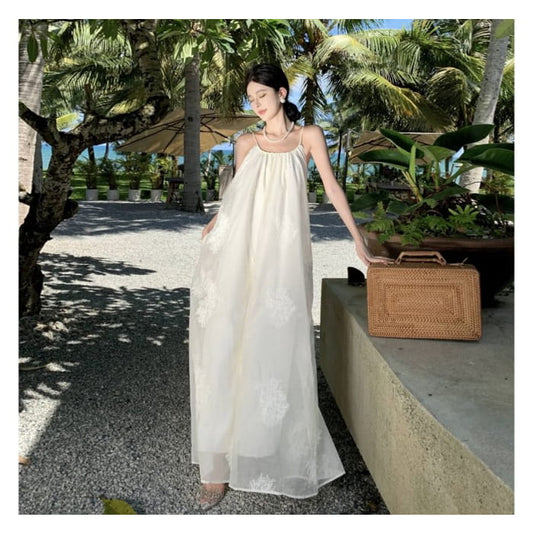 Spaghetti Strap Floral Embroidered Midi Sundress