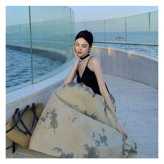 Spaghetti Strap V-Neck Printed Paneled Midi A-Line Dress
