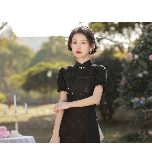 Puff-Sleeve Stand Collar Frog Buttoned Mini A-Line Dress