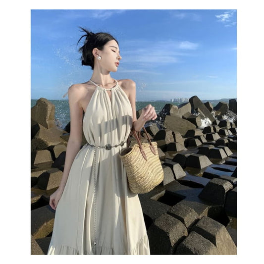 Set: Halter-Neck Plain Keyhole Midi Sundress + Chain Belt