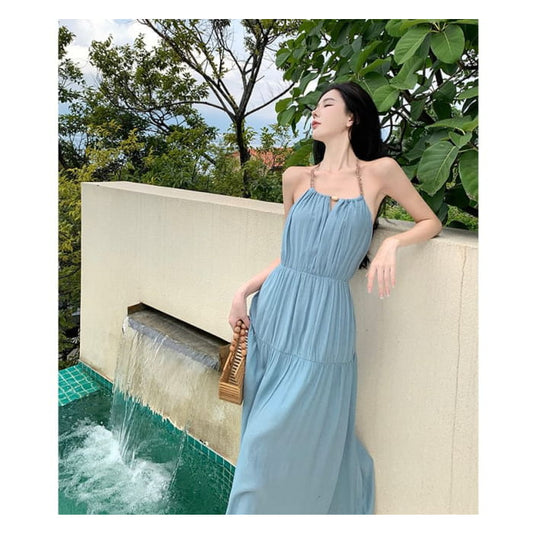 Halter-Neck Chained Plain Shirred Midi A-Line Dress