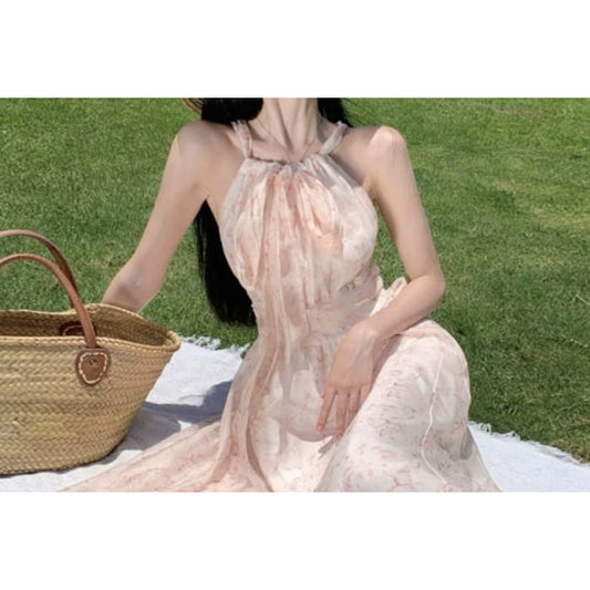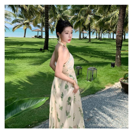 Halter-Neck Floral Print Midi A-Line Dress / Ruffled Jacket