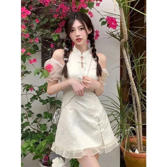 Cold-Shoulder Stand Collar Frog Buttoned Ruffled Mini A-Line Dress