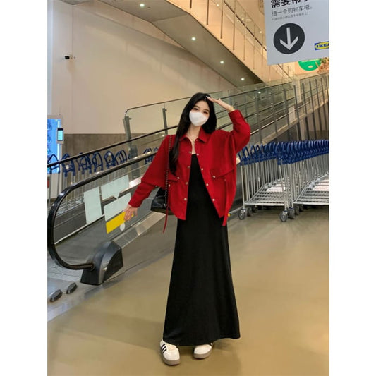 Sleeveless Scoop Neck Plain Maxi A-Line Dress / Long-Sleeve Collared Plain Button Shirt