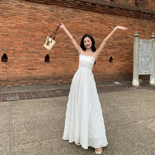 Spaghetti Strap Plain Cross Back Shirred Midi Sundress