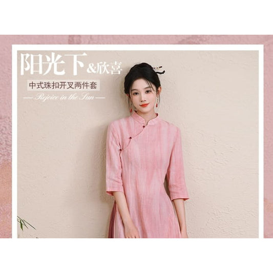 Set: Short-Sleeve Hanfu Long Top + Spaghetti Strap Plain Midi A-Line Dress
