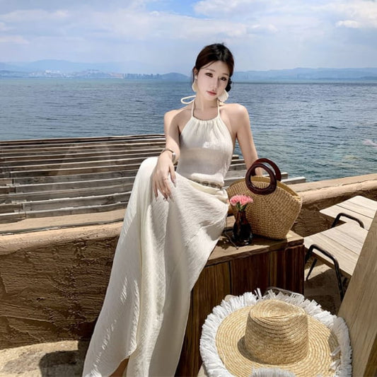 Set: Sleeveless One-Shoulder Plain Maxi A-Line Dress + Flower Choker