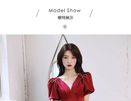 / V-Neck Short-Sleeve A-Line Dress Ribbon Beaded Evening Gown