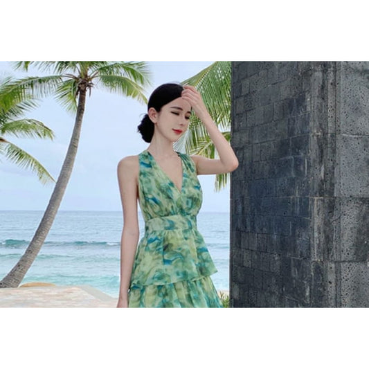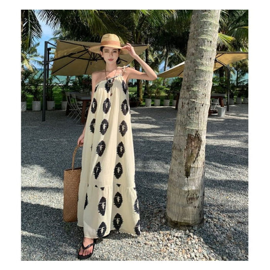 Halter V-Neck Patterned Print Tiered Maxi A-Line Dress