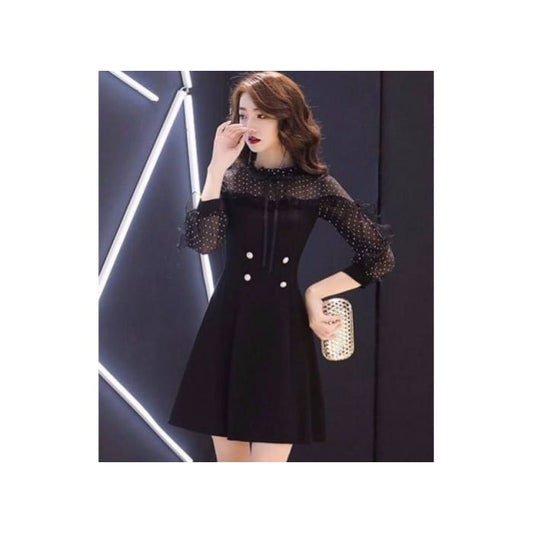 Mock Two-Piece Puff-Sleeve Double-Breasted Ruffled Paneled Mini A-Line Dress