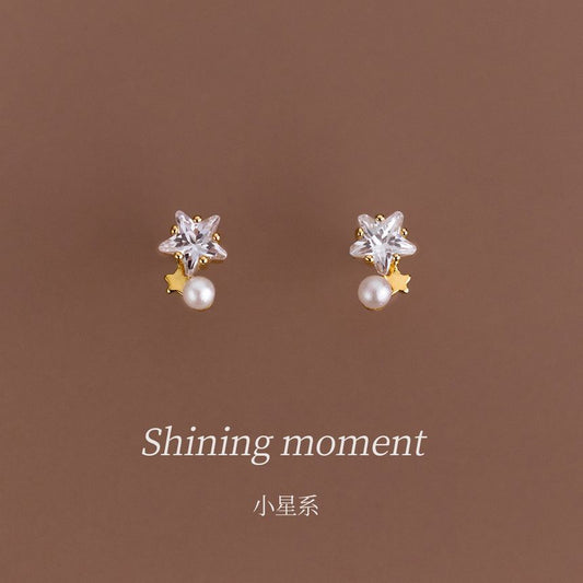925 Sterling Silver Rhinestone Star Faux Pearl Stud Earring