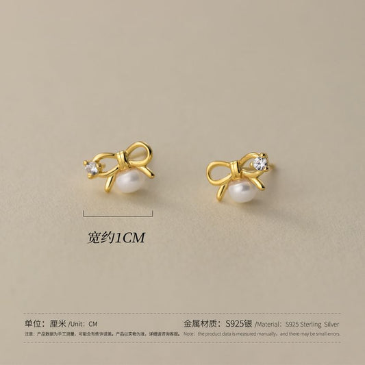 S925 Sterling Silver Bow Rhinestone Faux Pearl Stud Earring