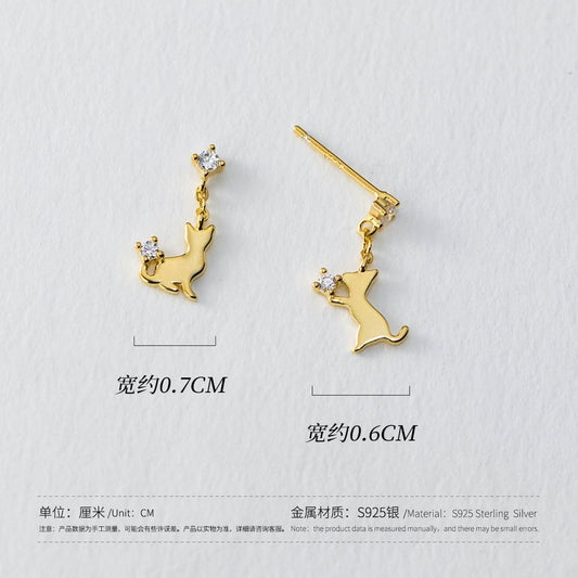 925 Sterling Silver Rhinestone Cat Asymmetrical Drop Earring