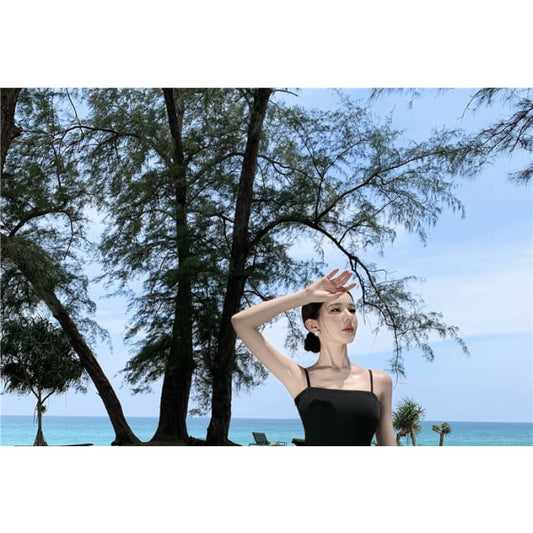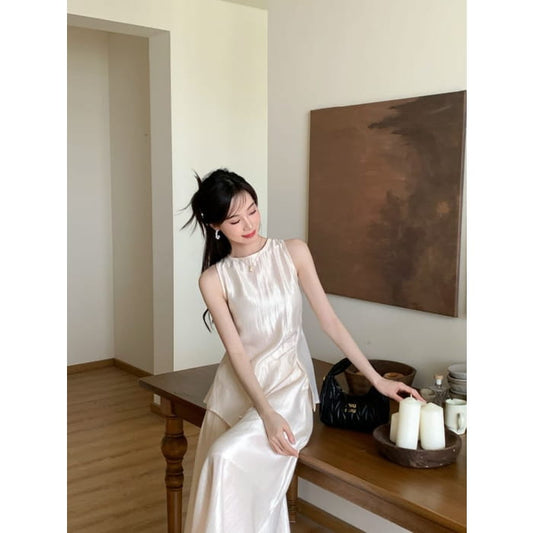 Set: Sleeveless Round Neck Slit Top + Mid Waist Plain Midi