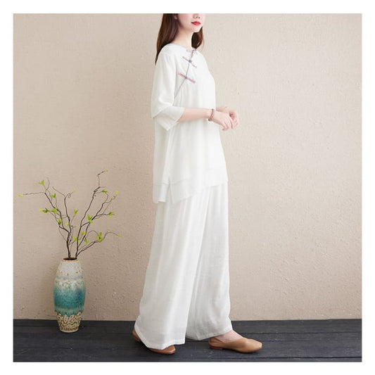 Set: 3/4-Sleeve Plain Frog Buttoned Cheongsam Top + High Rise Plain Wide Leg Pants