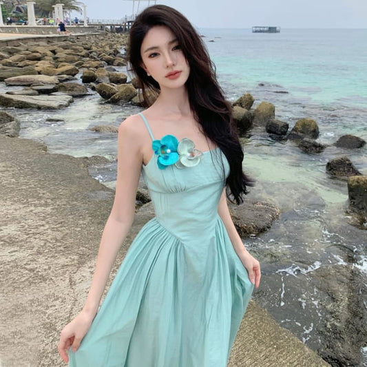 Spaghetti Strap Plain Flower Detail Maxi Sundress