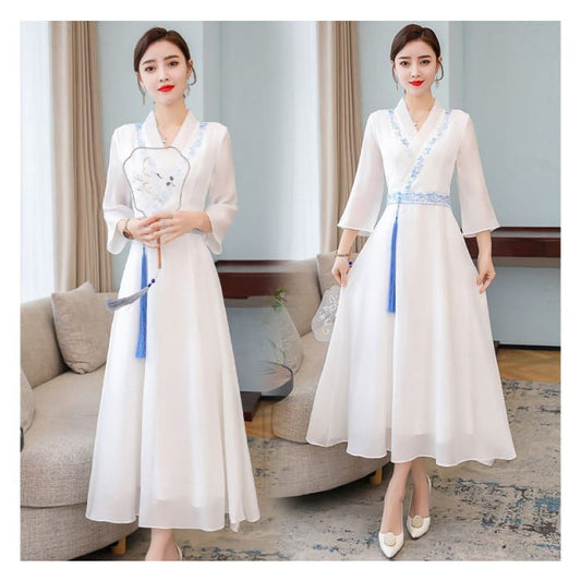3/4-Sleeve V-Neck Floral Embroidered Tasseled Midi A-Line Dress