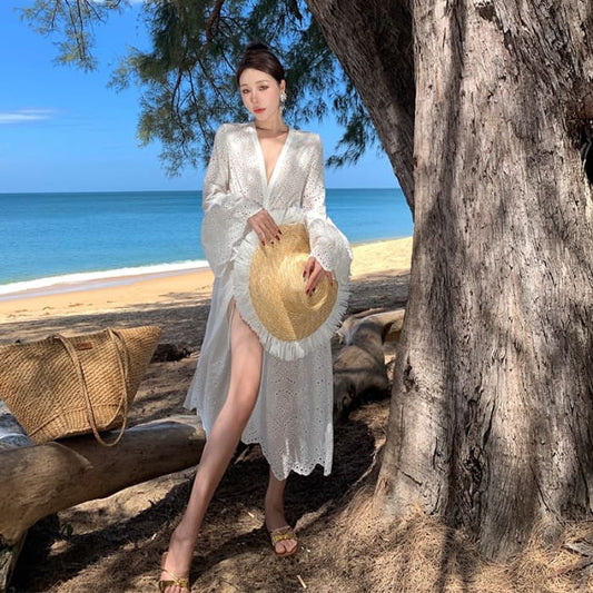 Long-Sleeve V-Neck Plain Slit Midi A-Line Eyelet Lace Dress