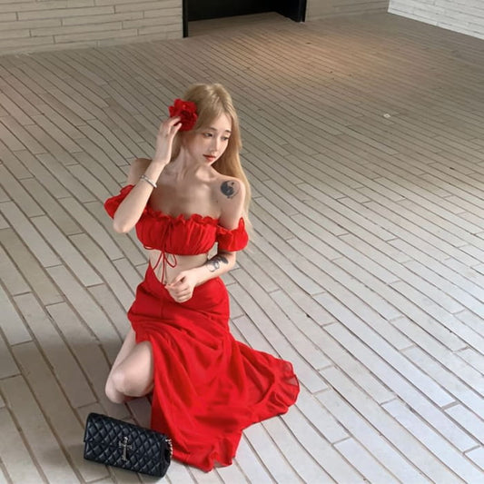 Set: Off-Shoulder Plain Crop Top + High Waist Side-Slit Maxi Pencil Skirt
