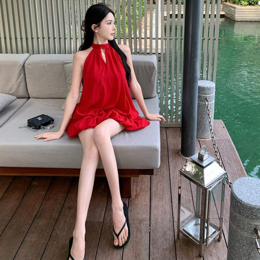 Sleeveless Plain Asymmetrical Slit Ruffle Trim Midi Sheath Dress