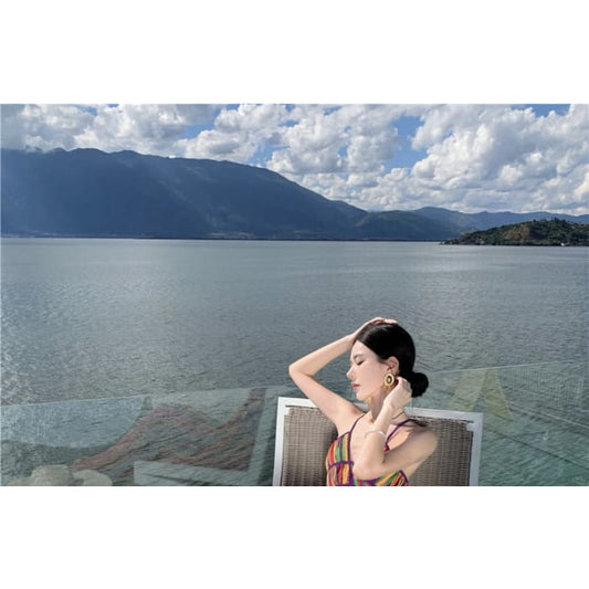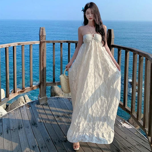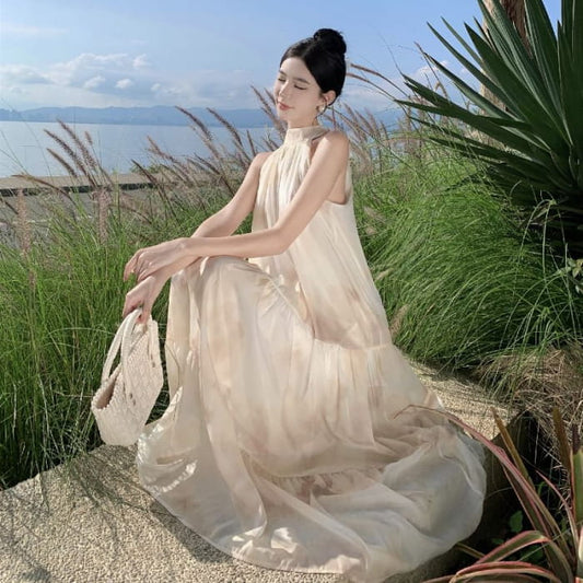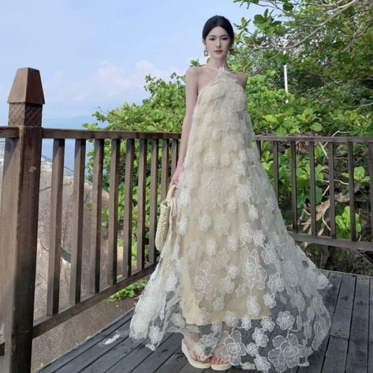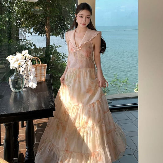 Sleeveless Sailor Collar Floral Open Back Tiered Mesh Maxi