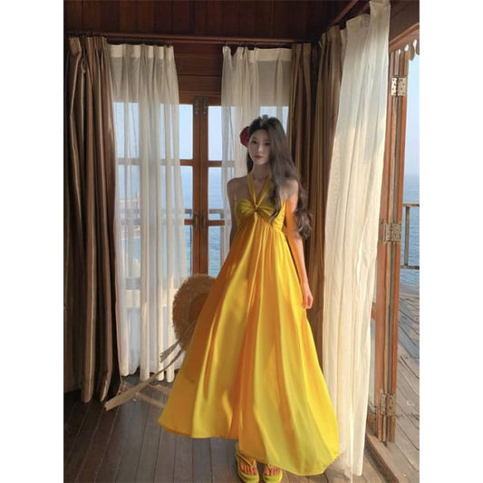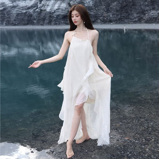 Halter Plain Open Back Slit Ruffle Trim Maxi