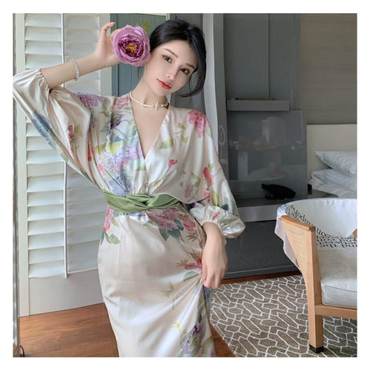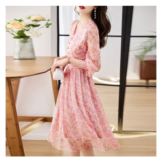Long-Sleeve V-Neck Floral Print Button Midi A-Line Dress