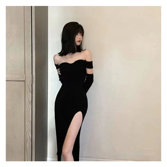 Long-Sleeve Off Shoulder Plain Backless Knit Midi Sheath Dress