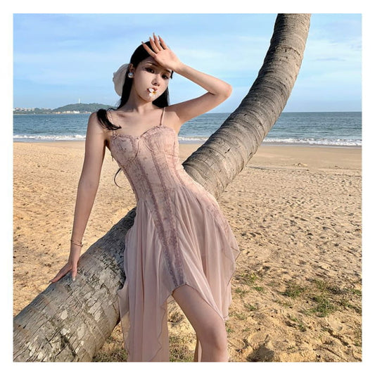 Spaghetti Strap Floral Asymmetrical Mesh Panel A-Line Corset Dress