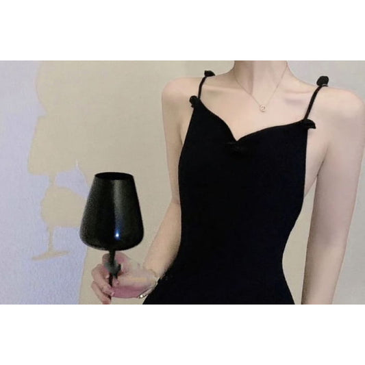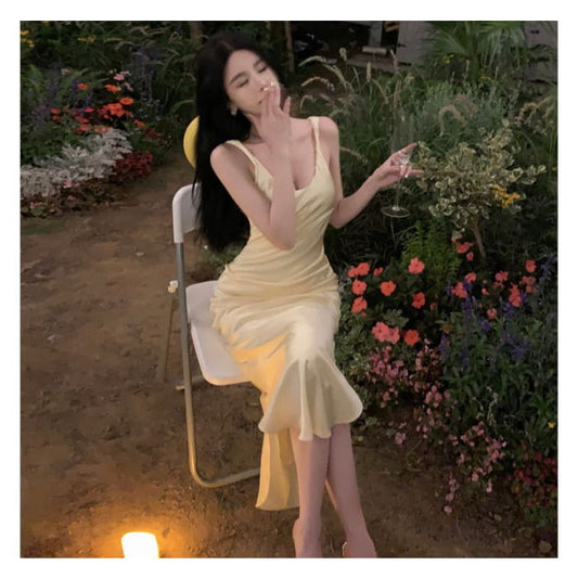 Spaghetti Strap U-Neck Satin Plain Maxi Bodycon Dress