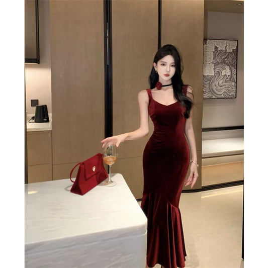 Sleeveless Square Neck Plain Velvet Maxi Mermaid Dress