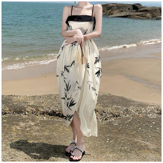 Spaghetti Strap Leaf Print Front-Slit Midi A-Line Dress