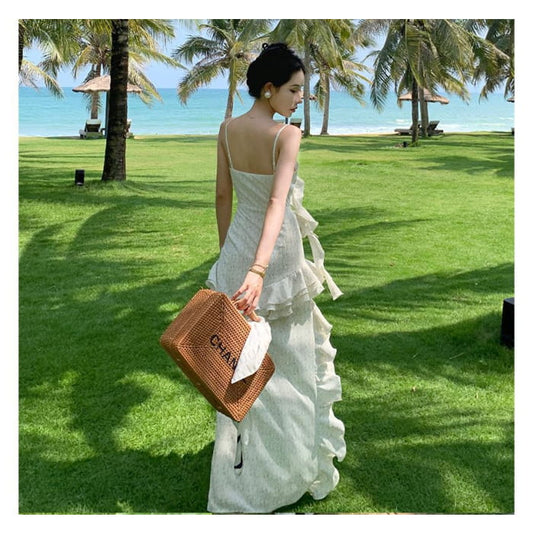 Spaghetti Strap Patterned Ruffle Asymmetrical Maxi Sundress