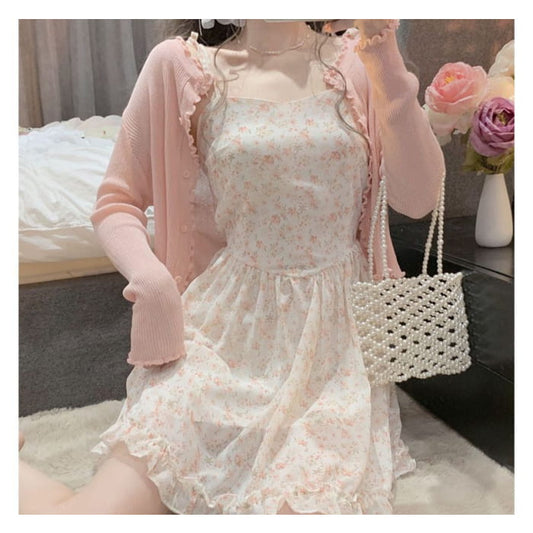 Spaghetti Strap Floral Mini A-Line Dress / Plain Lettuce Edge Cardigan