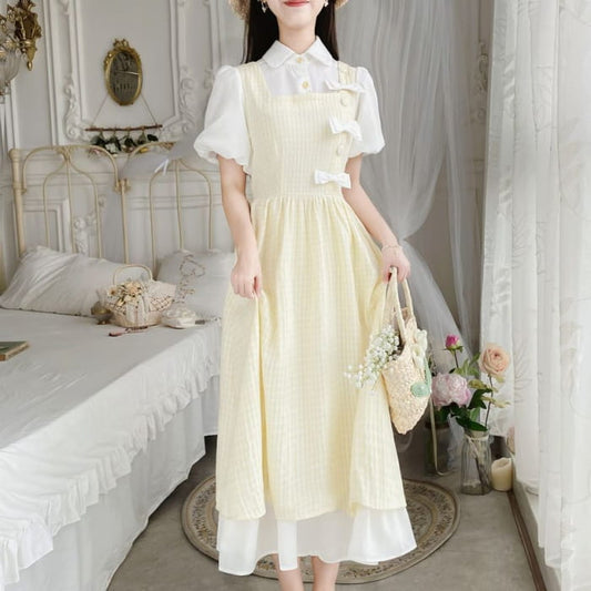Puff Sleeve Collared Bow Mock Two Piece Midi A-Line Dress