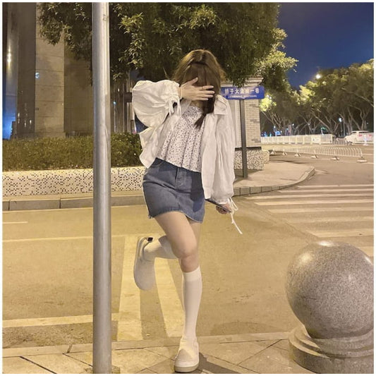 Puff-Sleeve Plain Light Jacket / Floral Flowy Camisole Top