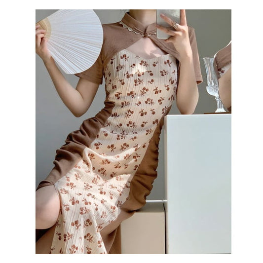 Set: Short-Sleeve Shrug + Spaghetti Strap Floral Print Bodycon Dress