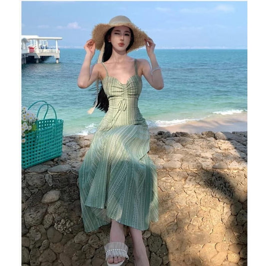 Spaghetti Strap Print Drawstring Open Back Midi A-Line Sundress