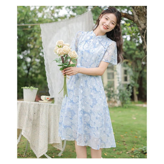 Short-Sleeve Band Collar Floral Print Midi A-Line Dress