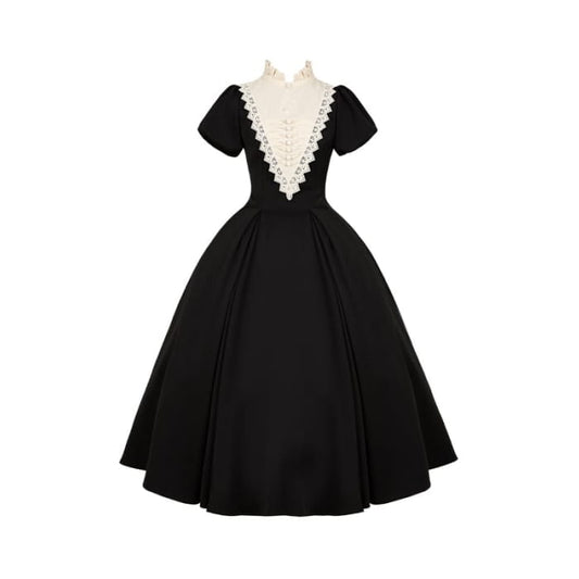 Elegant Black and Beige Ruffle Banded Collar Long Dress
