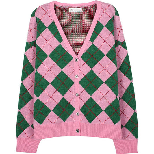Green Pink Argyle Pattern Cardigan