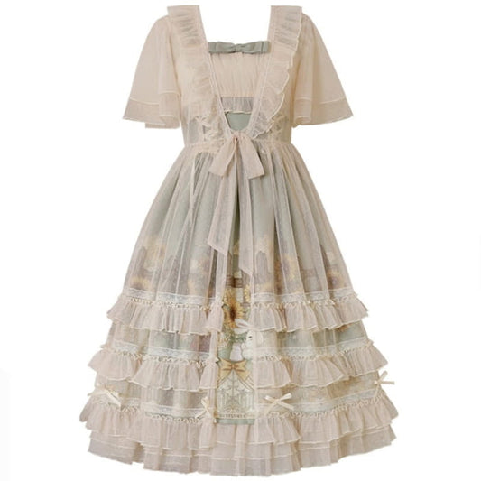 Elegant Sunflower Bunny Print Bow Lolita Lace-up Slip Dress
