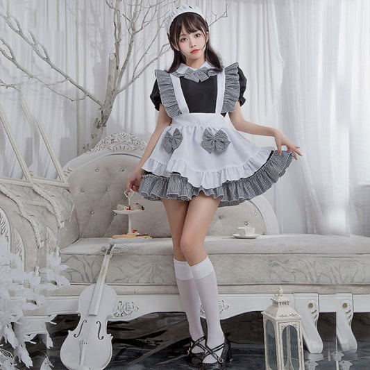 Kawaii Plaid Bow Tie Lolita Maid Ruffle Costume Dress