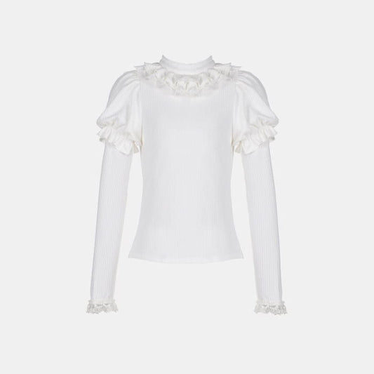 Lolita Bowknot Plush Overalls Puff Sleeve Lace Shirt