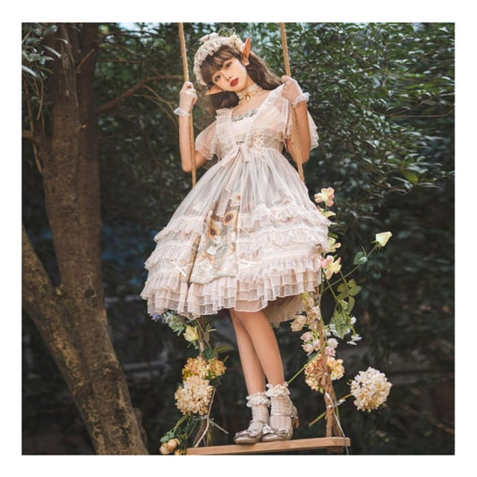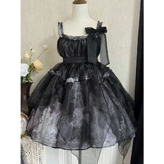 Lolita Puff Sleeve Stand Collar Bow Ruffle Blouse / Spaghetti Strap Butterfly Floral Print Midi A-Line Dress / V-Neck Mock Two Piece Lace Up Mesh Midi A-Line Overall Dress / Set