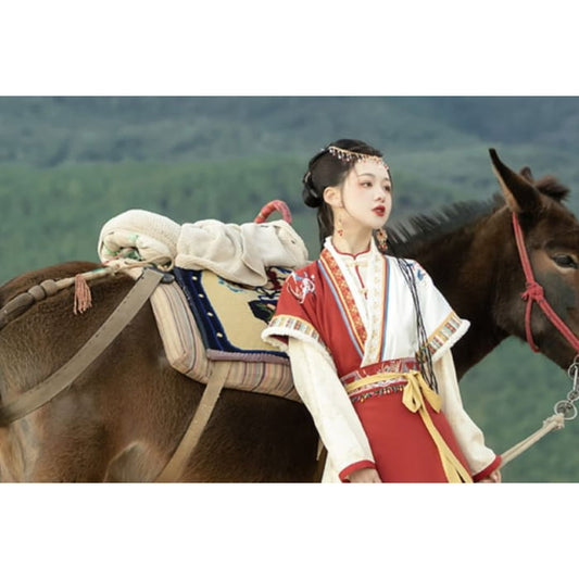 Lolita Long-Sleeve Stand Collar Contrast Trim Frog Closure Blouse / Short-Sleeve Floral Embroidered Fluffy Trim Hanfu Top / High Waist Pleated Panel Maxi A-Line Skirt / Set