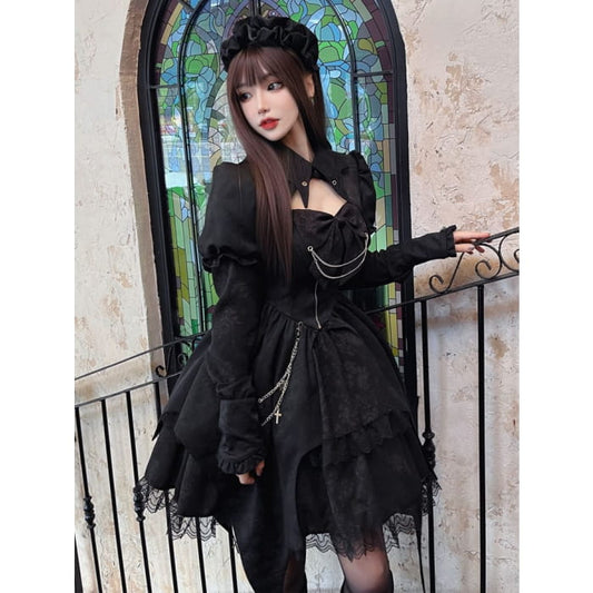 Lolita Puff Sleeve Collared Plain Cutout Ruffle Lace Up Mini A-Line Dress / Chain / Crinoline / Set