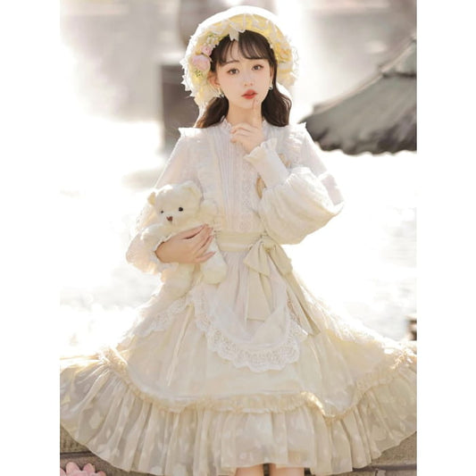 Lolita Long-Sleeve Square Neck Lace Trim Mini A-Line Dress / Crinoline / Set