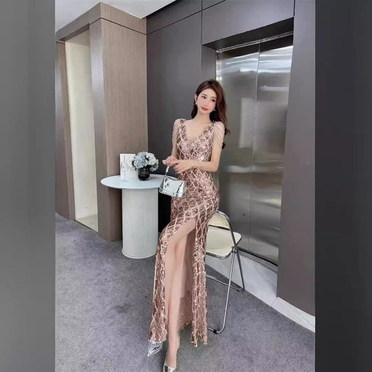 Sleeveless Fringed Gown Sequin Bead Slit Mermaid Evening V-Neck